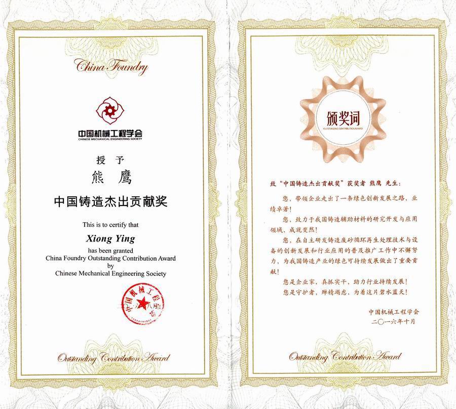 2016年10月28日,在成都金牛宾馆举行的第六届中国机械工程学会第十三届全国铸造年会上举行了“中国铸造终身成就奖”、“中国铸造杰出贡献奖”颁奖仪式。重庆xk网站造型材料集团公司董事长熊鹰先生荣获“中国铸造杰出贡献奖”。xk网站材料同时被评为优秀团体会员单位。